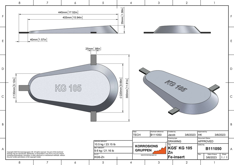 Zinkanod NoCor© Zn Marine Grade, 105 - 405 x 220 x 35 mm/15.94 x 8.66 x 1.38 inches